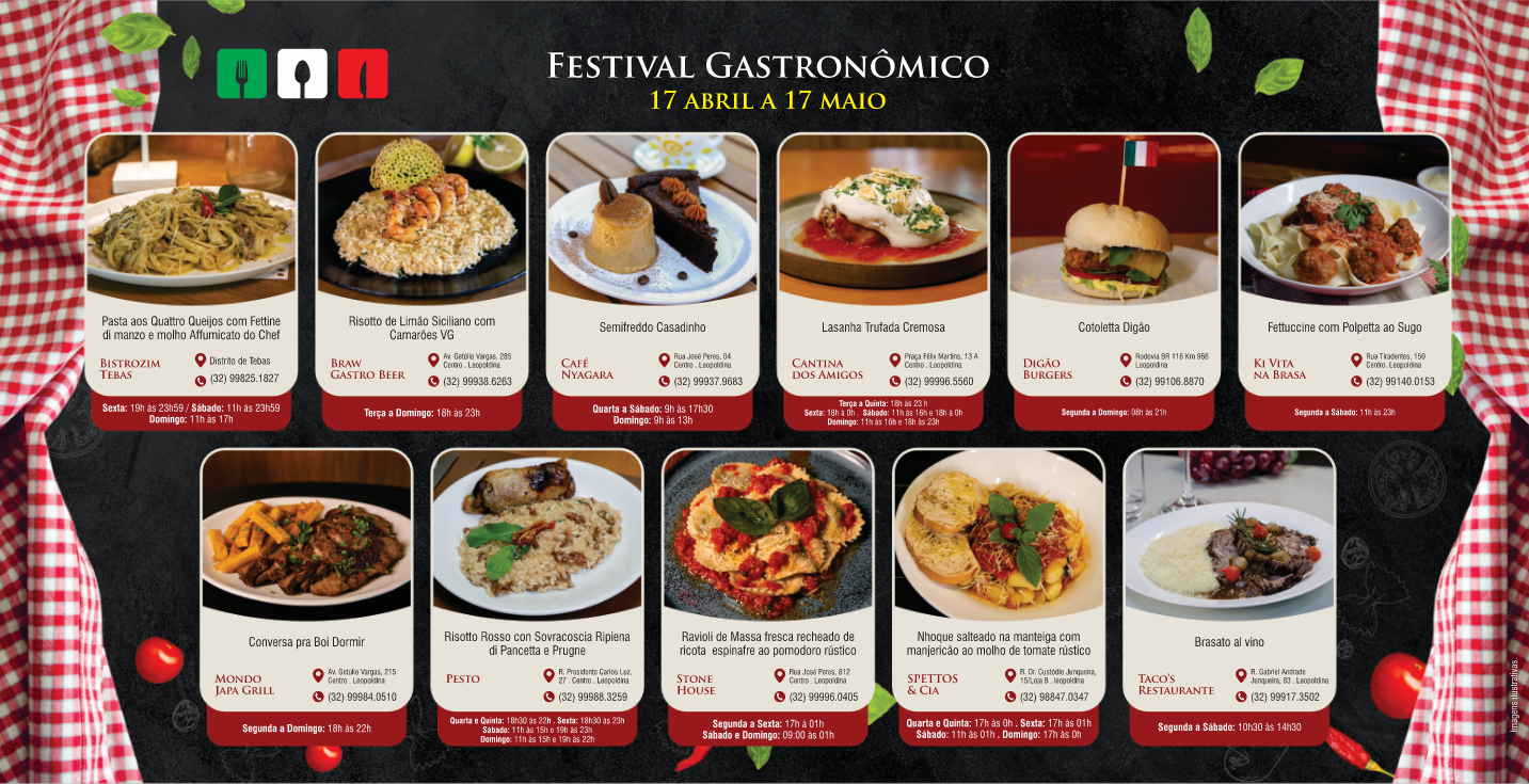 Conheça o Roteiro Gastronômico do Festival do Imigrante Italiano de Leopoldina e junto com ele, o tão esperado Concurso do Melhor Prato Italiano.